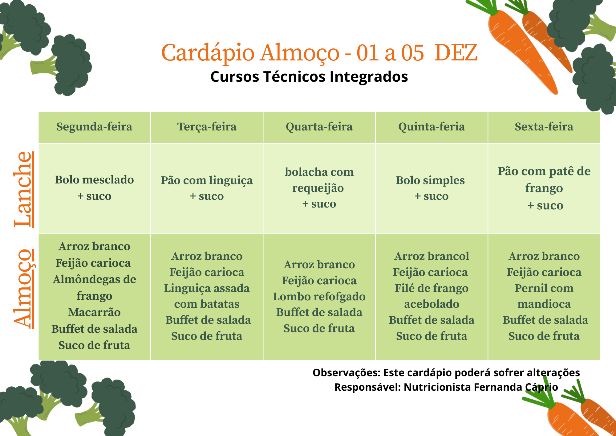 Para os estudantes dos Cursos Técnicos Integrados, além do lanche servido no primeiro intervalo da manhã e no intervalo da tarde, é oferecido gratuitamente o almoço. O cardápio é planejado semanalmente, levando em consideração a sazonalidade dos vegetais, a aceitabilidade das preparações e as demandas nutricionais específicas de nosso público.