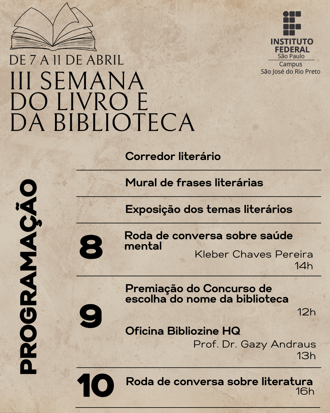 A programação contará com oficina de Fanzine, rodas de conversas, mural de frases literárias, corredor literário, premiação do concurso de escolha do nome da biblioteca e divulgação do nome selecionado pela comunidade interna.